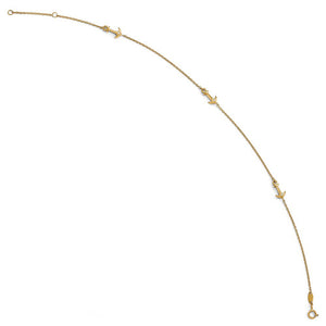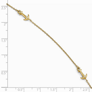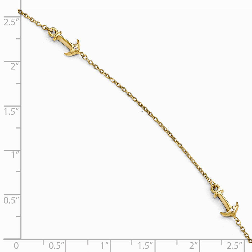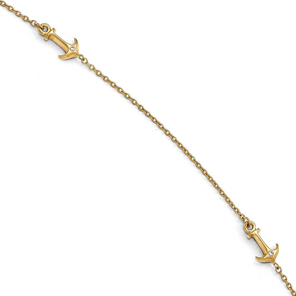 A timeless classic design created from 14k yellow gold and cubic zirconia gemstones featuring three anchor charms stationed on a 1mm cable chain that closes with a spring ring clasp. This polished ankle bracelet is adjustable from 9 or 10 inches in length.