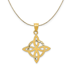 Tie the meaning to the moment with a classic or unusual pendant that makes it personal, thoughtful, or meaningful. This Celtic knot pendant, also known as the witches or magic knot, crafted in 14k yellow gold features a polished and diamond cut finish. The approximate size is 23mm (7/8 inch) in width by 32mm (1 1/4 inch) in length with the bail. Includes a 18 inch long, 0.9mm wide, solid 14k yellow gold cable chain with a spring ring clasp.