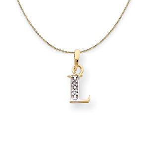 Adding a touch of glamour to your favorite initial is two prong-set white diamonds that are I-J in color, I3 in clarity. Each 8mm (5/16 Inch) letter is fashioned from 14k yellow gold with white rhodium plating and the approximate length including the tapered bail is 16mm (5/8 Inch). The pendant is . Includes a 16 inch, 0.8mm 14k yellow gold cable chain with a lobster clasp.