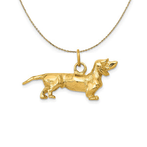 Warm your heart and elevate your style with a fashionable dog charm featuring your favorite breed. This short-legged hound captured in 14k yellow gold features a three-dimensional solid design with a high polished finish. It measures approximately 30mm (1 1/8 Inch) in width by 13mm (1/2 Inch) in length. The pendant is . Includes a 16 inch, 0.8mm 14k yellow gold cable chain with a lobster clasp.