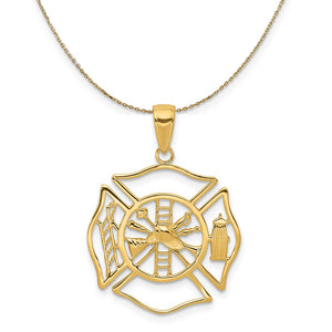 Show your appreciation for those amazing men and women providing emergency services to our communities with this fireman's shield pendant designed from polished 14k yellow gold. It measures approximately 21mm (13/16 inch) in width by 28mm (1 1/10 inch) in length, which includes the tapered bail. The pendant is Includes a 22 inch, 0.8mm 14k yellow gold cable chain with a lobster clasp.
