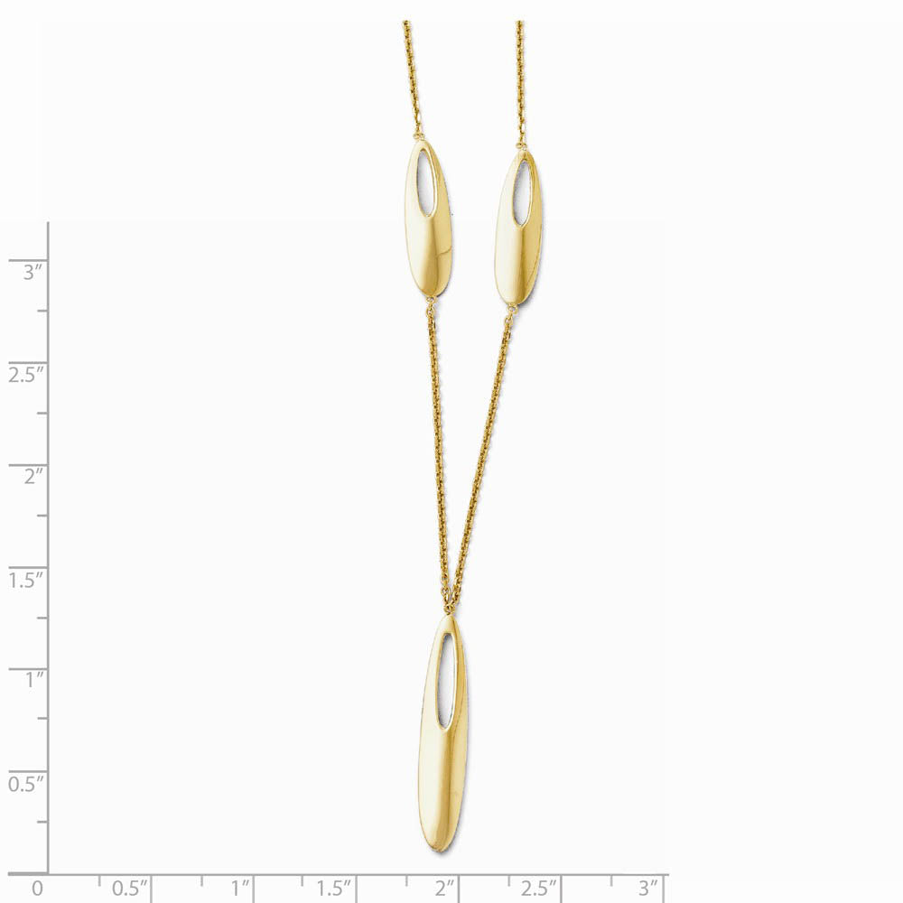Italian artistry and craftsmanship complement the sleek styling and elegance in this unique 18-20 inch adjustable necklace made from polished 14k yellow gold. It features a dangling oval pendant that is approximately 6mm (1/4 Inch) in width by 30mm (1 3/16 Inch) in length and smaller oval charm stations on a 1mm cable chain finished with a fancy lobster clasp and 2-inch chain extender. Made in Italy.