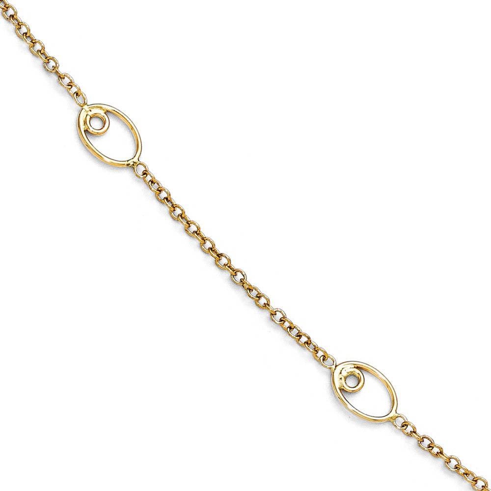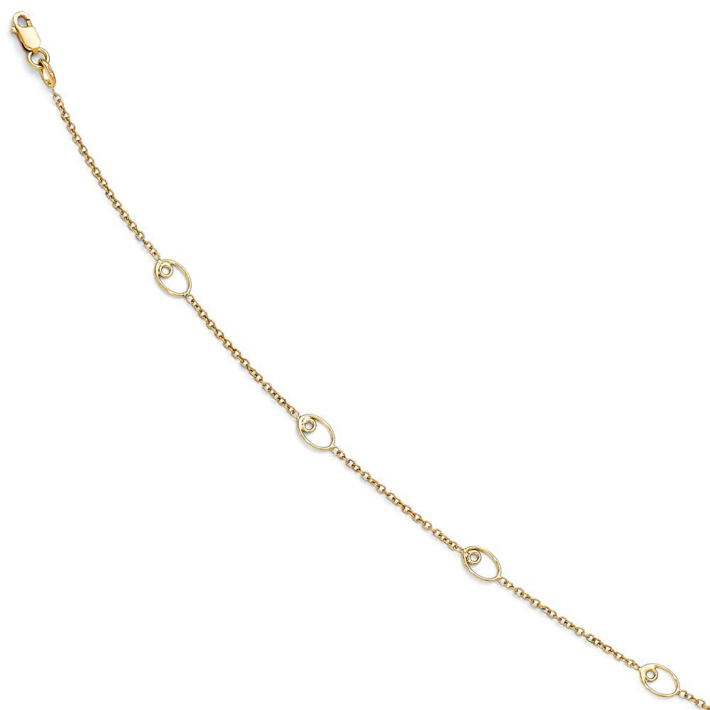 Indulge in a little bling for your leg with a shiny 14k yellow gold anklet featuring fancy oval link stations on a 1.25mm width cable chain. It is approximately 5mm in width, adjustable in length from 10 to 11 inches and closes with a lobster claw clasp. Made in Italy.