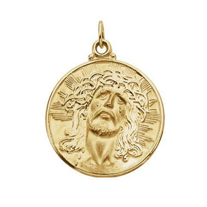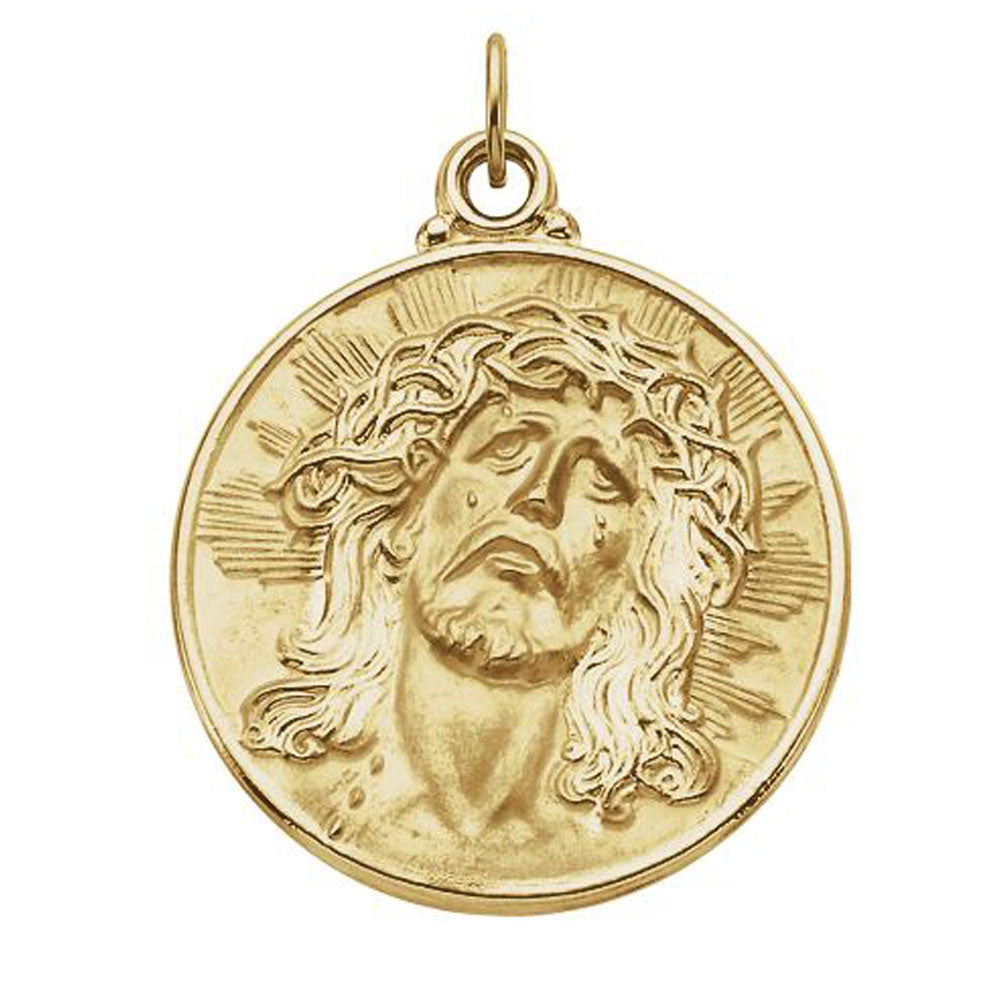 Celebrate and honor all special occasions with jewelry of religious significance! Our collection of spiritually inspired designs that show faith, hope and devotion are perfect for commemorating life's milestones. This Face of Jesus pendant crafted in 14k yellow gold features a polished embossed design. The approximate size is 22mm (7/8 inch) in diameter. This item does not include a chain.