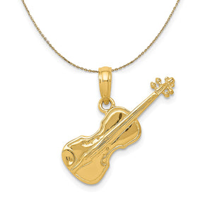Jazz up your style with a gleaming 14k yellow gold pendant depicting your favorite musical instrument. This detailed violin features a solid three-dimensional design that is approximately 8mm (5/16 Inch) in width by 24mm (15/16 Inch) in length. The pendant is . Includes a 24 inch, 0.8mm 14k yellow gold cable chain with a lobster clasp.