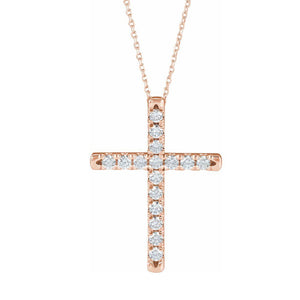 Celebrate and honor all special occasions with jewelry of religious significance! Our collection of spiritually inspired designs that show faith, hope and devotion are perfect for commemorating life's milestones. This Latin cross necklace created in 14k rose gold is french set with 16 natural diamonds that are 2.5mm in size, I1 in clarity and G-H in color. The total diamond weight is 1.0 carat. The approximate pendant size is 22mm (7/8 inch) in width by 31mm (1 1/4 inch) in length. The diamond-cut cable chain closes with a spring ring clasp, is 1mm in width and adjustable in length from 16 to 18 inches. This is a made to order item and is estimated to ship 12/1/2025