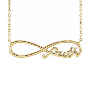 Celebrate and honor all special occasions with jewelry of religious significance! Our collection of spiritually inspired designs that show faith, hope and devotion are perfect for commemorating life's milestones. With its elegant design and beautiful meaning this 14k yellow gold faith infinity necklace is one of our favorites. The pendant is approximately 28mm (1 1/8 inch) in width by 7mm (1/4 inch) in length. The attached diamond-cut cable chain is 1mm in width, 18-inches in length and closes with a spring ring clasp.