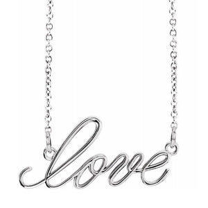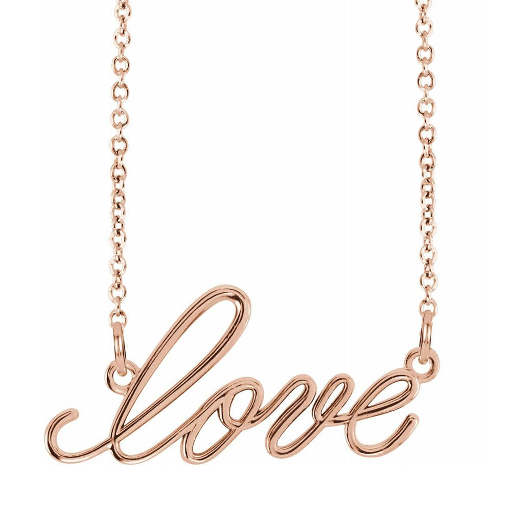 14K Yellow, White or Rose Gold Small Love Script Necklace, 16 Inch