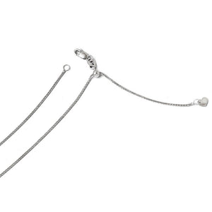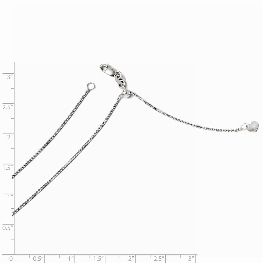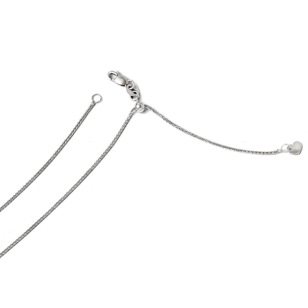 Interwoven solid links of rhodium-plated 14k white gold form a distinctive braided design that will add elegance and beauty to your favorite charm or pendant. This delicate 1mm wide wheat chain features a dazzling diamond-cut finish and a slide mechanism with a lobster clasp that adjusts to any length up to 22 inches. Made in Italy.