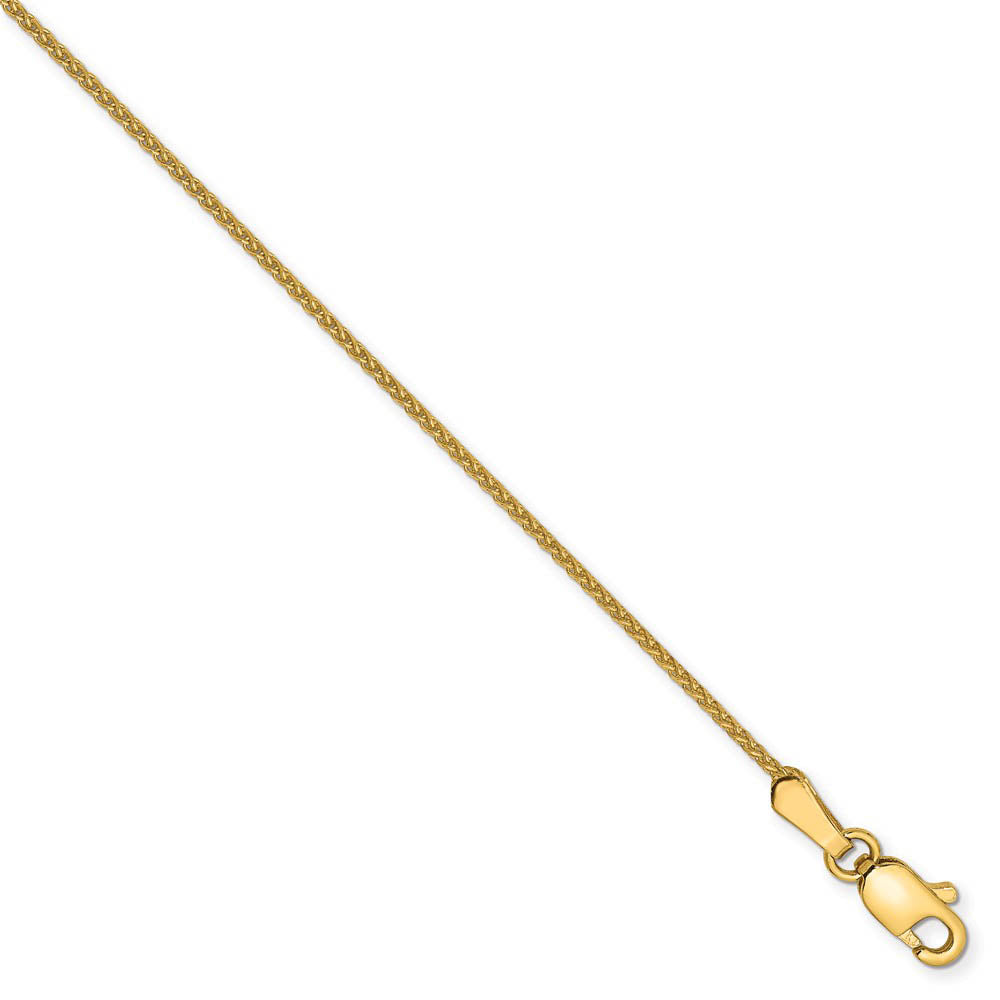 This 1mm width, solid link spiga chain is crafted from diamond-cut 14k yellow gold and closes with a lobster clasp. 10 inches in length.