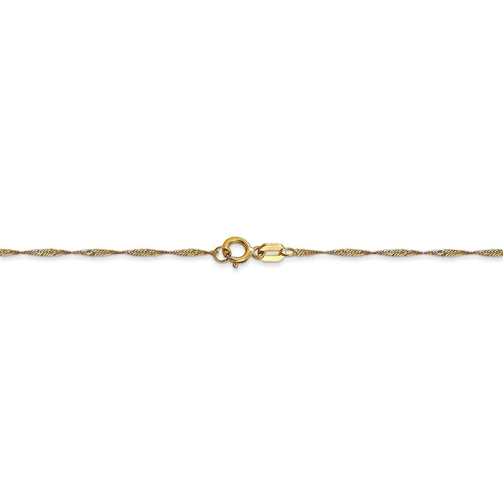 • Indulge in the luxury of 14-karat yellow gold with this delicate 1mm width, 18-inch long Singapore chain. It closes with a spring ring clasp and the twist style design will compliment your yellow gold charm or pendant to perfection.