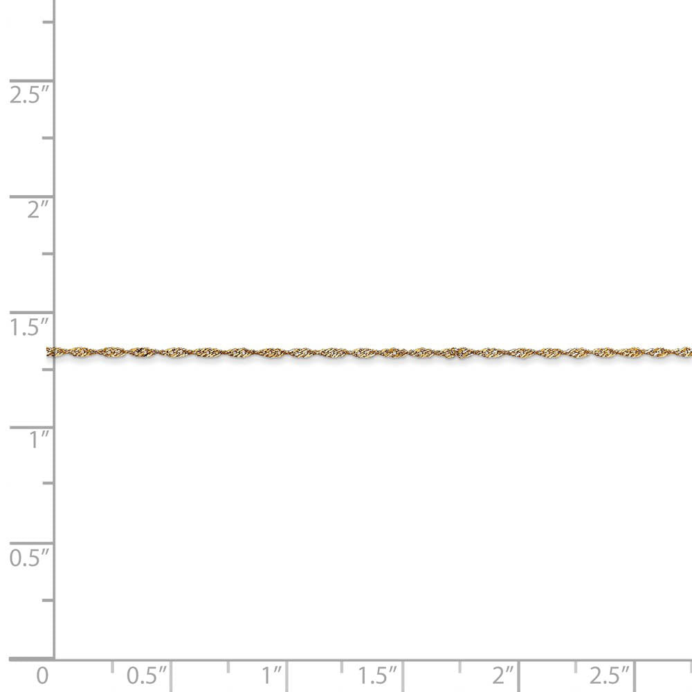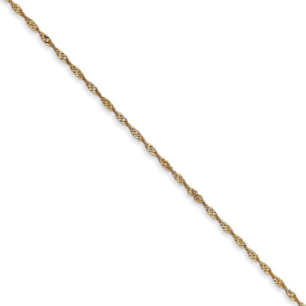 Indulge in the luxury of 14-karat yellow gold with this delicate 1mm width, 16-inch long Singapore chain. It closes with a spring ring clasp and the twist style design will compliment your yellow gold charm or pendant to perfection.
