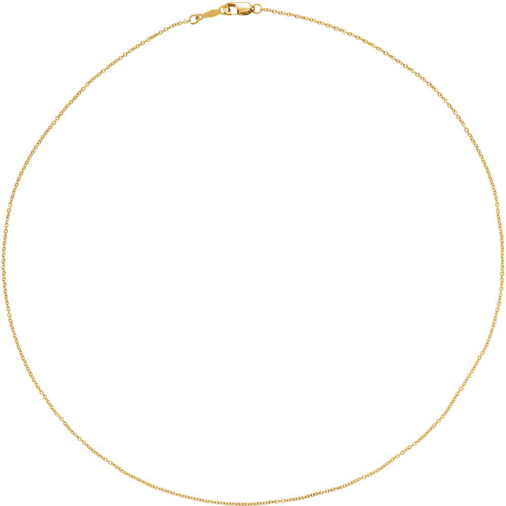 Solid oval links of 14k yellow gold interlock with alternating links turned 90-degrees to create a classic cable chain design that never goes out of style. This polished necklace measures 1mm in width by 16-inches in length and fastens with a lobster claw clasp.