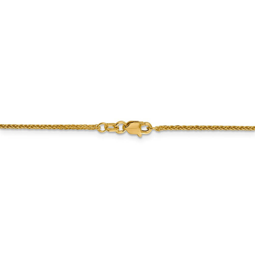 • This beautiful chain intricately woven from 14k yellow gold features a braided wheat pattern with a contemporary square shape that is 1mm in width by 20 inches in length. While this style is not as flexible or liquid-like as some other styles, it will complement your favorite charm or pendant to perfection.