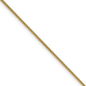 This beautiful chain intricately woven from 14k yellow gold features a braided wheat pattern with a contemporary square shape that is 1mm in width by 16 inches in length. While this style is not as flexible or liquid-like as some other styles, it will complement your favorite charm or pendant to perfection.
