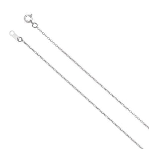 Solid oval links of 18k white gold interlock with alternating links turned 90-degrees to create a classic cable chain design that never goes out of style. This polished necklace measures 1mm in width by 16-inches in length and fastens with a spring ring clasp.