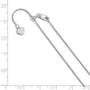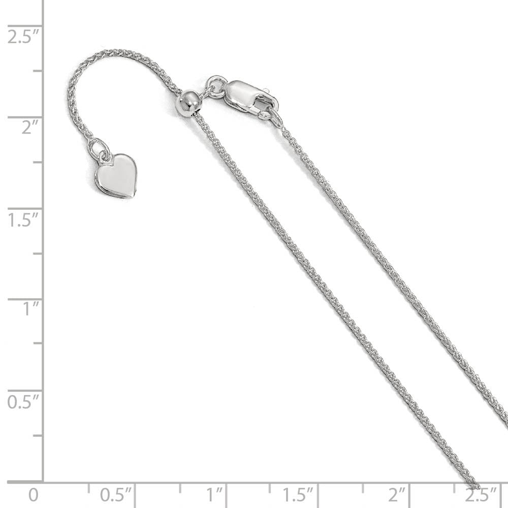 This 1mm rhodium plated sterling silver spiga chain features a three-dimensional braided design that is a bit more flexible than a classic wheat style and a slide mechanism with a lobster clasp that adjusts to any length up to 30 inches. Made in Italy.