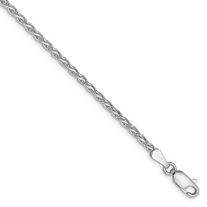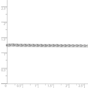 This beautiful chain intricately woven from rhodium-plated 14k white gold features a solid link, Parisian wheat pattern with a smooth polished finish. Crafted in the USA, this 2.25mm width bracelet chain comes complete with a lobster-claw clasp for a reliable fit. 7 inches in length.