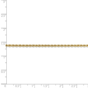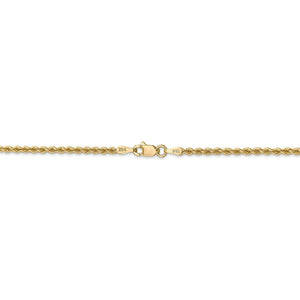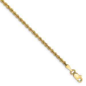 A traditional 14k yellow gold rope chain measuring 2.25mm in width is handmade and closes with a lobster claw clasp. Its versatile, solid link design is ideal for women and children. 7 inches in length.