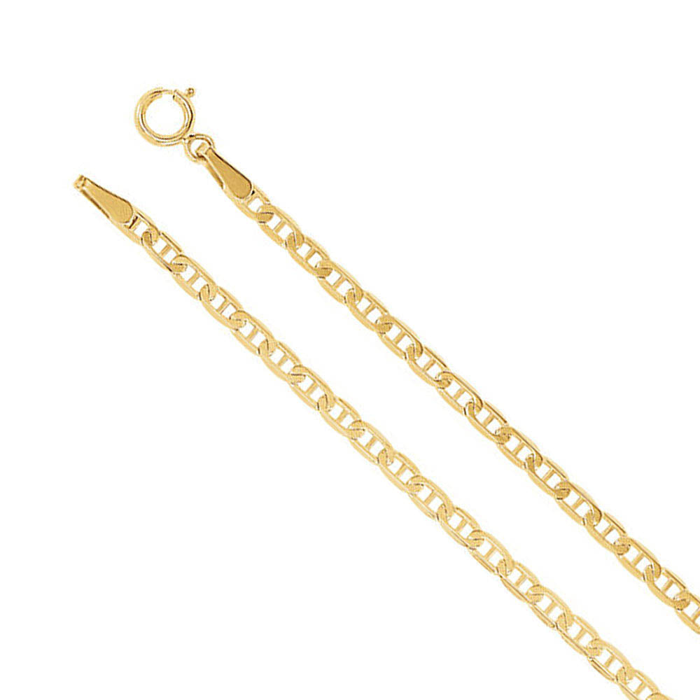 A nautical style design crafted to resemble the cable used to anchor ships, also known as the mariner chain, creates a simple innovative styled necklace for your favorite pendant. This 2.25mm wide solid link chain designed from 14k yellow gold is finished with a spring-ring clasp and ideal for both men and women.