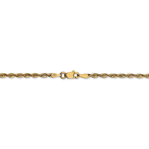 Spiraling rope chains made of 14k yellow gold enhanced with diamond-cuts are extremely popular because they offer a classic design with maximum shine. Flexible and strong, this solid link anklet chain measures 2.5mm in width by 9-inches in length and closes with a classic lobster-claw clasp.