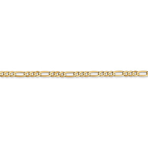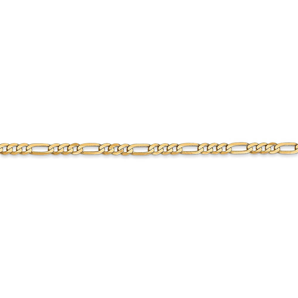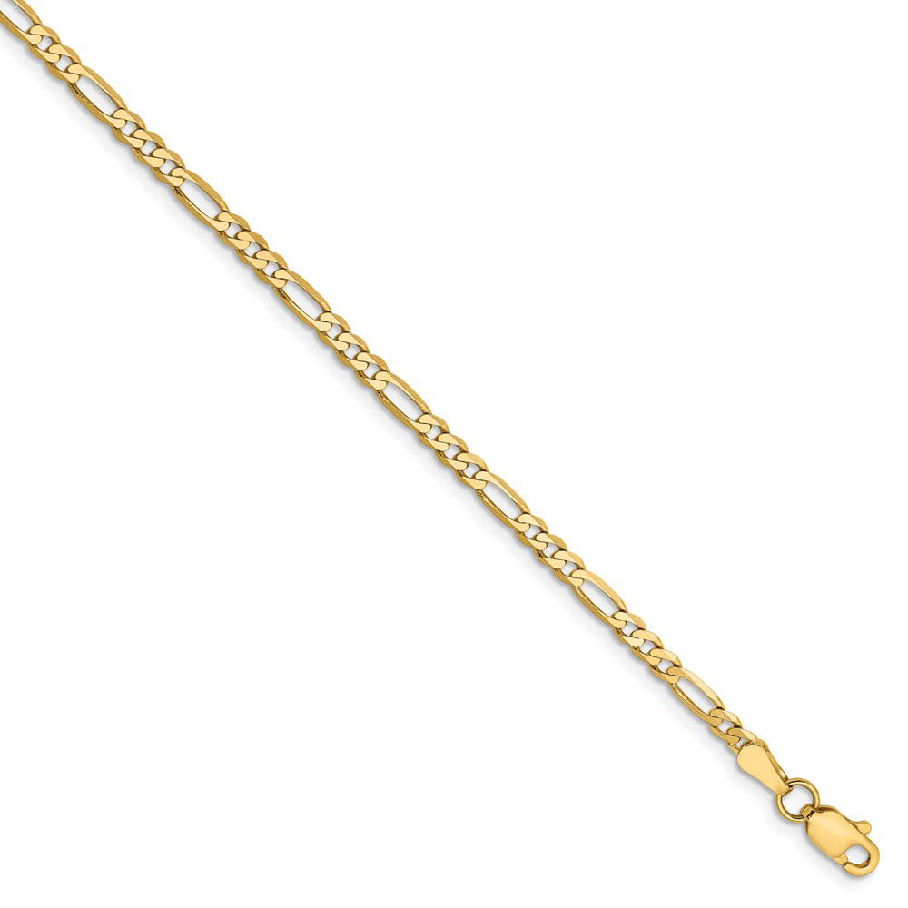 A beautiful basic, perfect on its own or combined with other chains to create your own personal style. Measuring 2.75mm in width, this polished figaro chain created from 14k yellow gold features a solid flat link design and closes securely with a lobster-claw clasp. 7 inches in length.