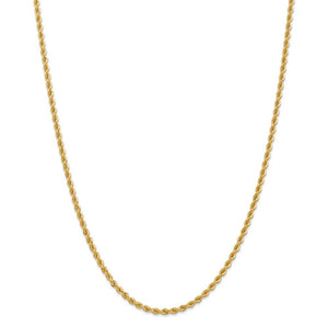 A traditional 14k yellow gold rope chain measuring 2.75mm in width is handmade and closes with a lobster claw clasp. Its versatile, solid link design is ideal for men and women. 22 inches in length.
