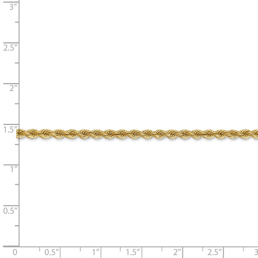 A traditional 14k yellow gold rope chain measuring 2.75mm in width is handmade and closes with a lobster claw clasp. Its versatile, solid link design is ideal for men and women. 30 inches in length.
