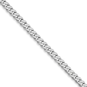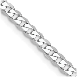 Ageless and classic, a curb or Cuban chain is one of the most durable single link styles. This polished necklace chain is created from rhodium-plated 14k white gold and features a solid link, flat beveled curb design that is approximately 2.9mm in width by 18-inches in length and closes with lobster claw clasp.