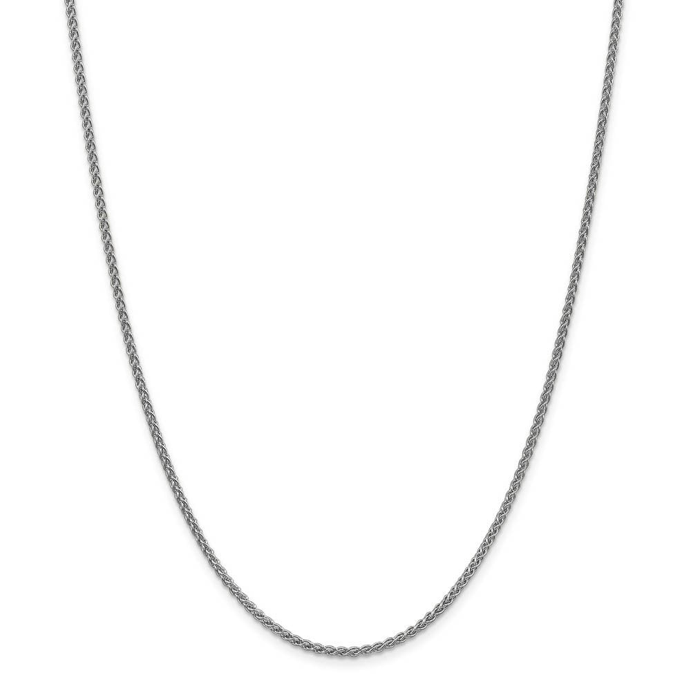 • This 2mm width, polished rhodium-plated 14k white gold, spiga chain features a solid link, braided design that is a bit more flexible than a classic wheat style and will complement your favorite charm or pendent to perfection with its three-dimensional style. It is 18 inches in length and closes with a lobster clasp.