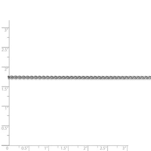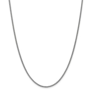 This 2mm width, polished rhodium-plated 14k white gold, spiga chain features a solid link, braided design that is a bit more flexible than a classic wheat style and will complement your favorite charm or pendent to perfection with its three-dimensional style. It is 16 inches in length and closes with a lobster clasp.