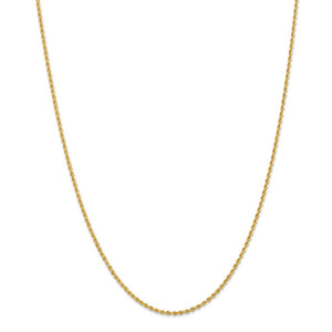 A traditional 14k yellow gold rope chain measuring 2mm in width is handmade and closes with a lobster claw clasp. Its versatile, solid link design is ideal for men and women. 22 inches in length.