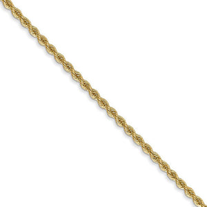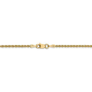 A traditional 14k yellow gold rope chain measuring 2mm in width is handmade and closes with a lobster claw clasp. Its versatile, solid link design is ideal for men and women. 20 inches in length.