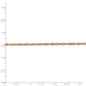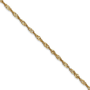 This 2mm width, solid link Singapore chain is crafted from polished, 14k yellow gold and closes with a lobster clasp. 18 inches in length.