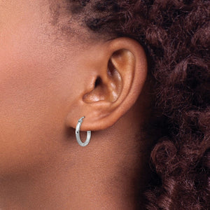 Slim and sleek, a traditional round silhouette highlighted with a satin polished finish and diamond cut accents that adds texture and extra shine to these gorgeous 2mm rhodium plated sterling silver hoop earrings.
