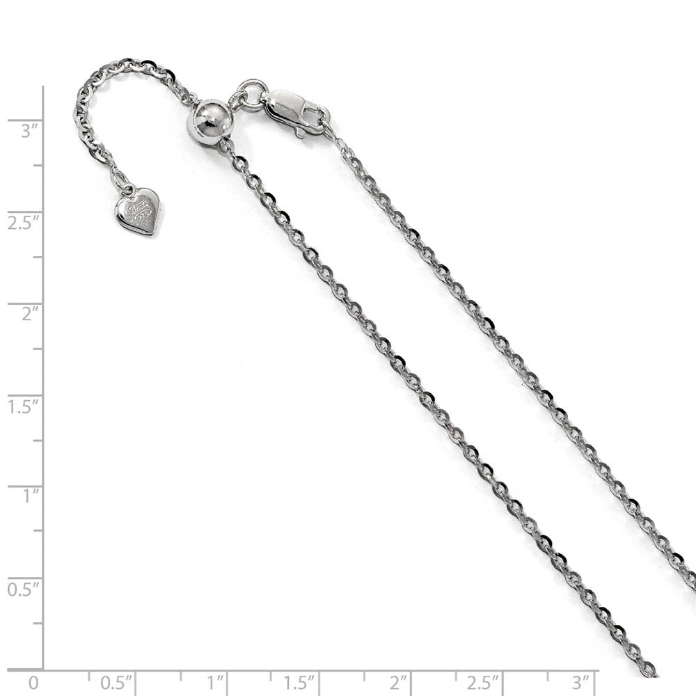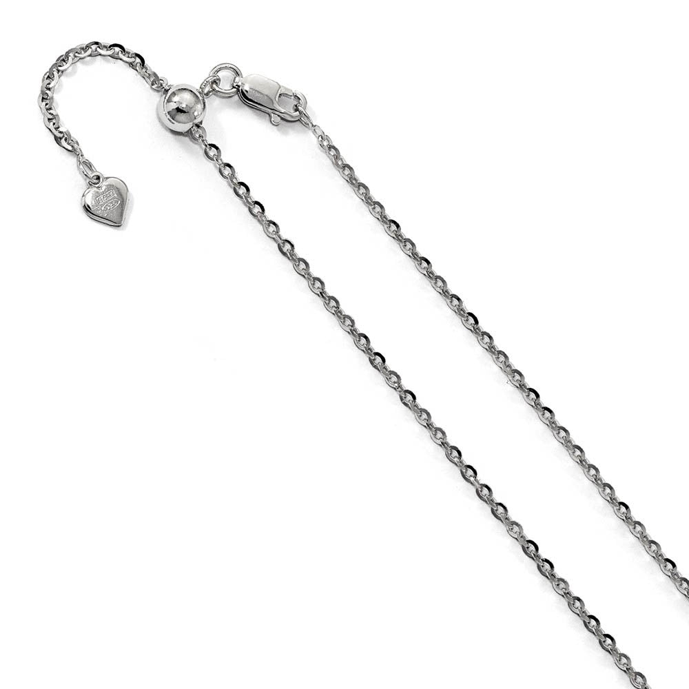 Oval links of rhodium plated sterling silver interlock with an alternating pattern to create a classic cable design that never goes out of style. This polished necklace chain is 2mm in width and features a slide mechanism with a lobster clasp that adjusts to any length up to 22 inches. Made in Italy.