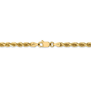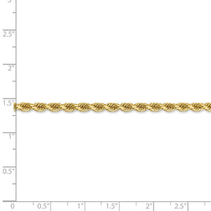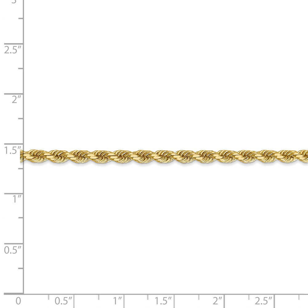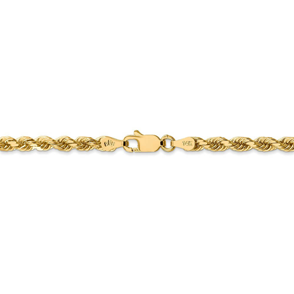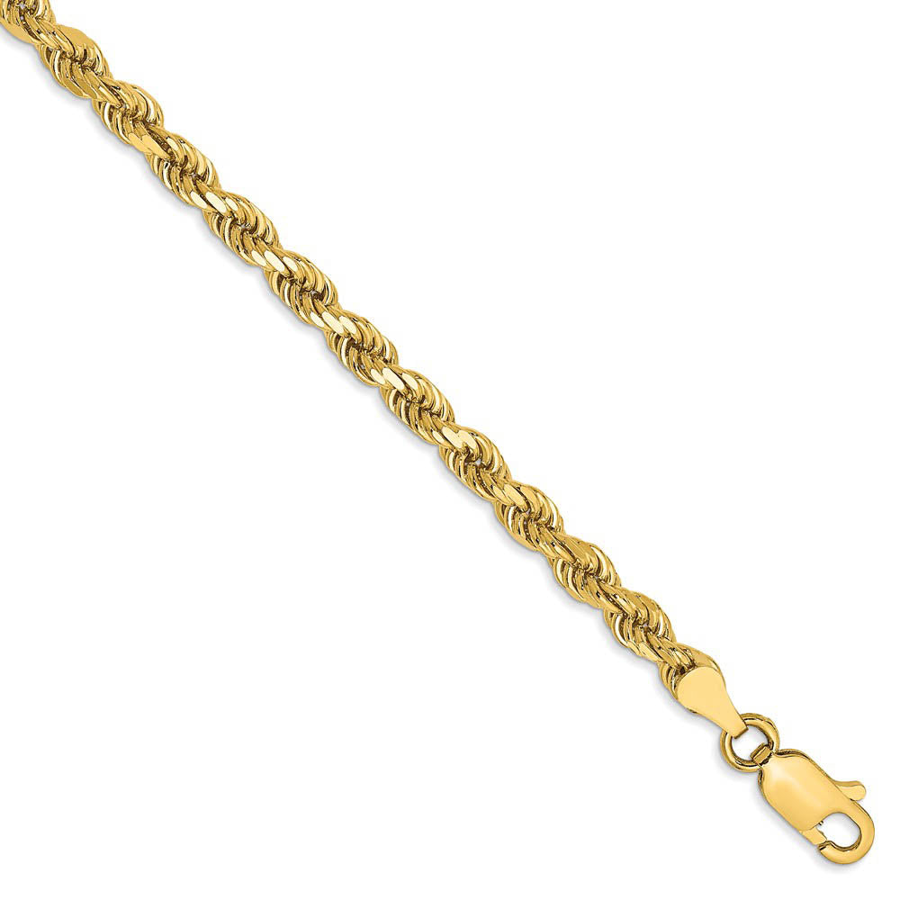 Twisting strands of 14k yellow gold form an intricate spiral pattern on this fabulous rope chain accented with a diamond-cut finish and finished with a lobster claw clasp. Designed to provide the perfect combination of beauty, strength and integrity, this solid link bracelet or anklet chain is 3.5mm in width by 9-inches in length.