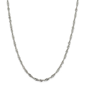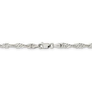 A series of interwoven loops on this elegant Singapore chain catches the light from every angle thanks to the twisted link design. It measures 3.5mm in width by 24-inches in length and is fashioned from polished sterling silver with a classic lobster claw clasp.