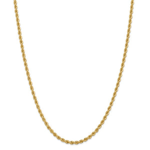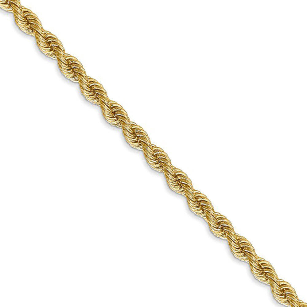 A traditional polished rope chain necklace measuring 3.65mm in width by 18 inches in length is handmade from 14k yellow gold and closes a classic lobster clasp. Its reliable solid link design is ideal for everyday wear and suitable for both men and women.