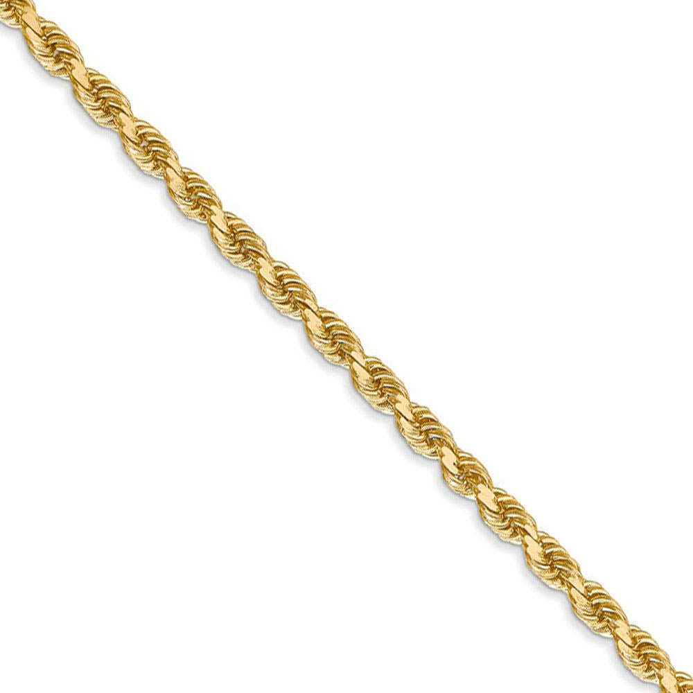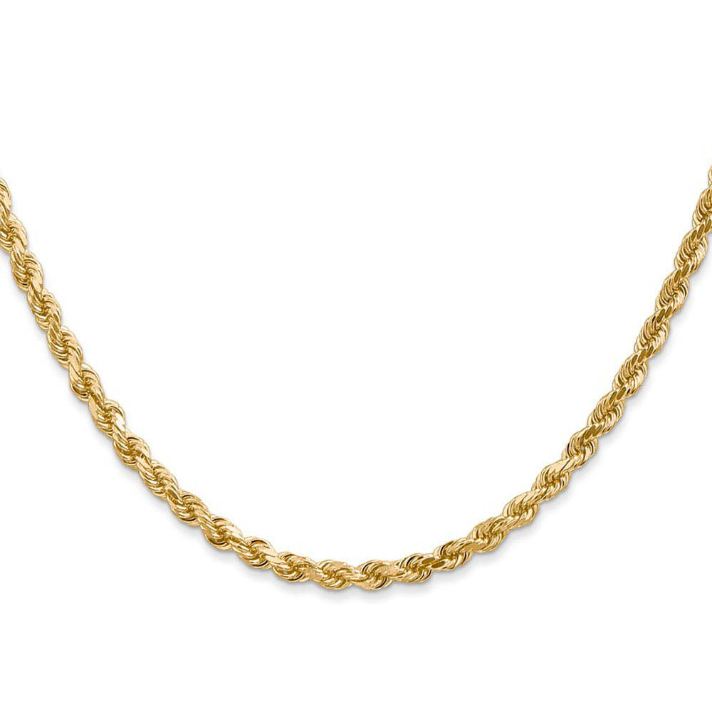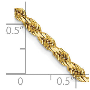 Spiraling rope chains made of 14k yellow gold enhanced with diamond-cuts are extremely popular because they offer a classic design with maximum shine. Flexible and strong, this 22-inch necklace chain is 3mm in width and fastens with a lobster claw clasp.
