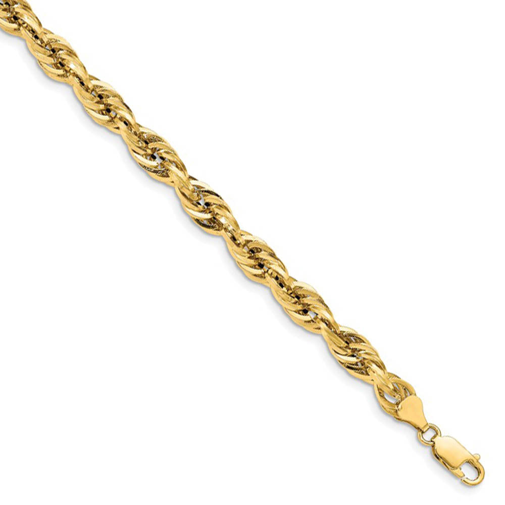 • A classic rope chain is the perfect indulgence for those who appreciate understated sophistication. This 4.25mm wide, 22-inch long polished rope chain necklace fashioned from 14k yellow gold with a hollow link and lobster clasp design looks great alone or paired with your favorite pendant.