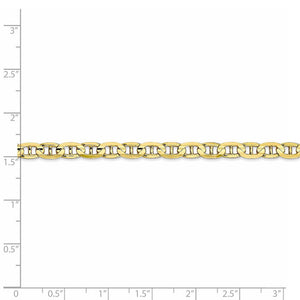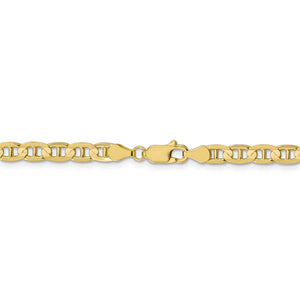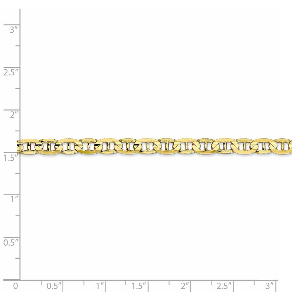 This polished anchor or mariner chain made of 10k yellow gold features a solid concave design that mimics the cable used to anchor boats with a vertical bar in the middle of each link. The 4.5mm width makes a beautiful bracelet and is perfect on its own or paired with other chains for a layered look. Closes with a reliable lobster claw clasp. 7 inches in length