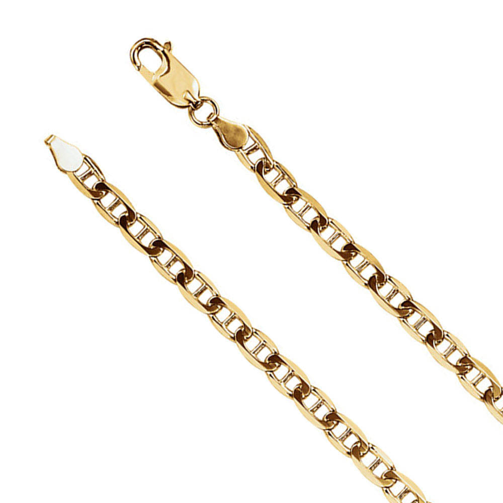 A nautical style design crafted to resemble the cable used to anchor ships, also known as the mariner chain, creates a simple innovative styled necklace for your favorite pendant. This 4.5mm wide solid link flat chain designed from 14k yellow gold is finished with a lobster claw clasp and ideal for both men and women.
