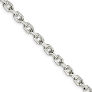 Cable chains are the most common type of jewelry chain that is made using an individual oval or round link interlocked in a uniform pattern, with each link lying at ninety degrees to the next. It is identical throughout, giving it a simple but classic look. This polished sterling silver necklace features solid open oval links that are beveled on the edge and approximately 4.9mm in width by 20-inches in length. It closes with a lobster claw clasp.