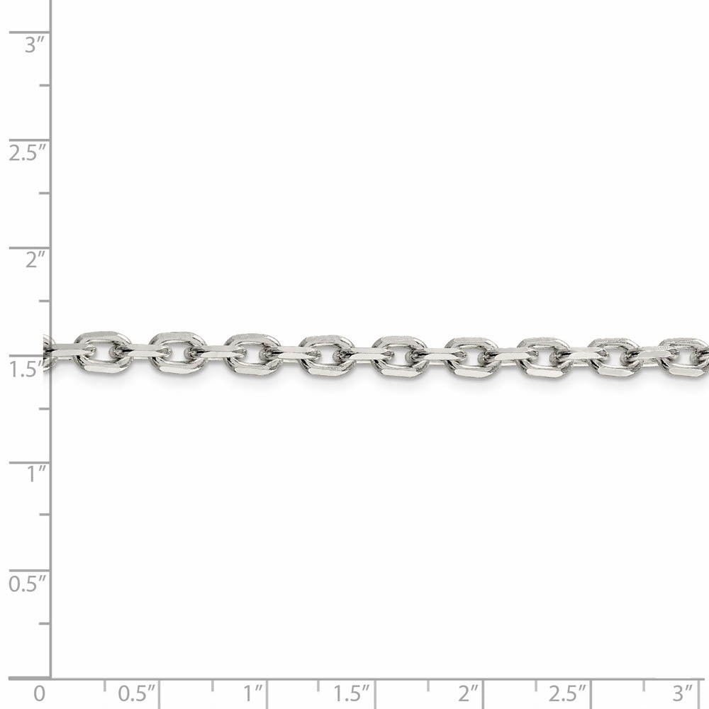 Cable chains are the most common type of jewelry chain that is made using an individual oval or round link interlocked in a uniform pattern, with each link lying at ninety degrees to the next. It is identical throughout, giving it a simple but classic look. This polished sterling silver necklace features solid open oval links that are beveled on the edge and approximately 4.9mm in width by 26-inches in length. It closes with a lobster claw clasp. This item is backordered and we estimate it to ship in approx. 10-12 days. Please email service@theblackbow.com for more details.