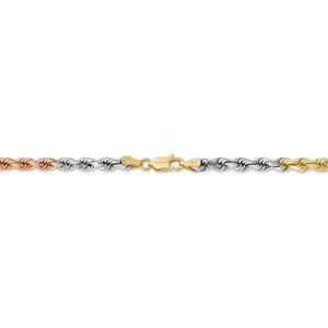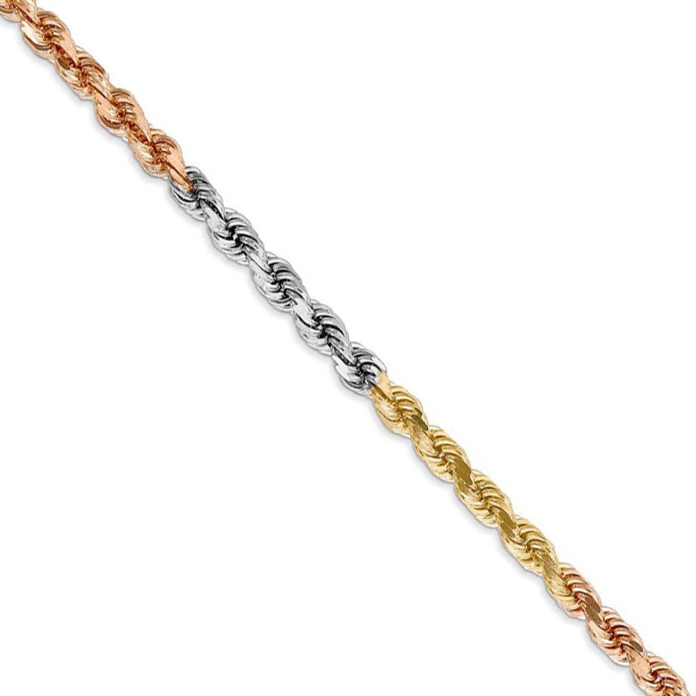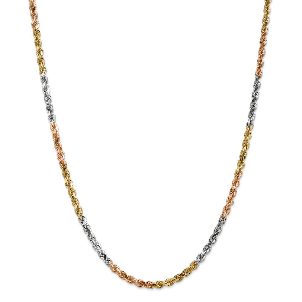 This stunning rope chain handmade from 14k yellow, white and rose gold features a sparkling, diamond-cut design that is finished with a secure, lobster clasp. It measures 4mm in width and looks great alone, layered with multiple chains or paired with a gold charm or pendant to complete your desire look. 24 inches in length.