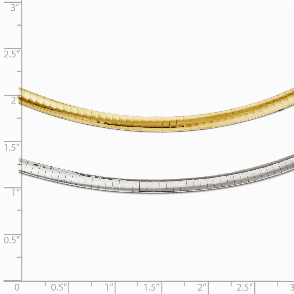 Two distinct styles in one versatile lightweight design featuring 14k yellow gold on one side and 14k white gold on the other. This 4mm width reversible omega chain fastens with a fancy omega clasp and is 16 inches in length. Made in Italy. This item is backordered and we estimate it to ship in approx. 10-12 days. Please email service@theblackbow.com for more details.