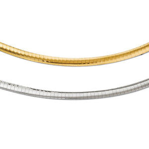 Two distinct styles in one versatile lightweight design featuring 14k yellow gold on one side and 14k white gold on the other. This 4mm width reversible omega chain fastens with a fancy omega clasp and is 18 inches in length. Made in Italy. This item is backordered and we estimate it to ship in approx. 10-12 days. Please email service@theblackbow.com for more details.