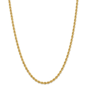 A traditional 14k yellow gold rope chain measuring 4mm in width is handmade and closes with a lobster claw clasp. Its versatile, solid link design is ideal for men and women. 24 inches in length.