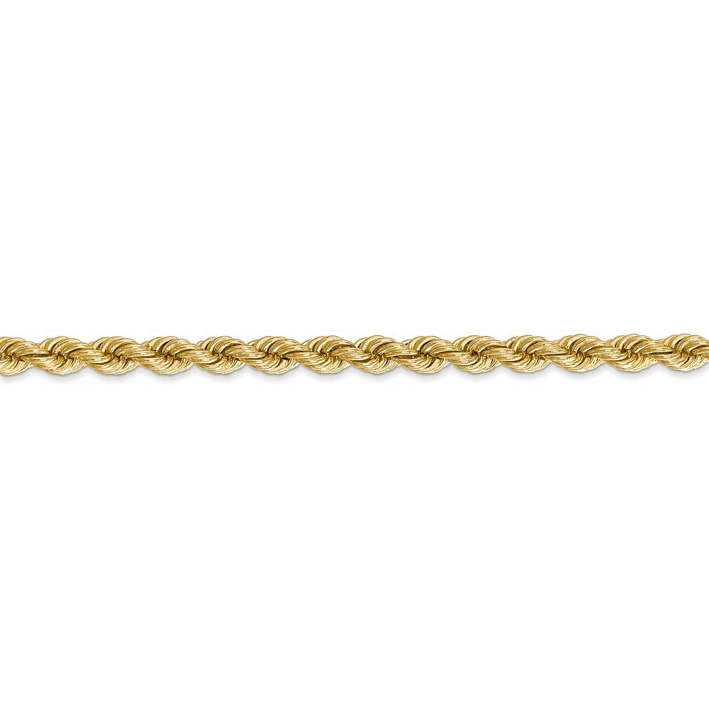A traditional 14k yellow gold rope chain measuring 4mm in width is handmade and closes with a lobster claw clasp. Its versatile, solid link design is ideal for men and women. 30 inches in length.